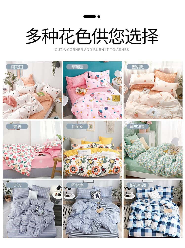 - 适用床尺寸: 0.9m三件套被套150*200cm 1.2m三件套被套150*200cm 1.5m四件套被套150*200cm 1.8m四件套被套180*220cm 2.0m四件套被套200*230cm 2.2m四件套被套220*240cm